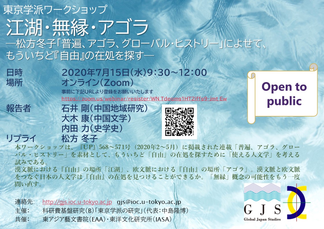 本ワークショップは、『UP』568~571号(2020年2~5月)に掲載された連載「普遍、アゴラ、グローバル・ヒストリー」を素材として、もういちど「自由」の在処を探すために「使える人文学」を考える試みである。漢文脈における『自由』の場所「江湖」、欧文脈における『自由』の場所「アゴラ」。漢文脈と欧文脈をつなぐ日本の人文学は『自由』の在処を見つけることができるか。「無縁」概念の可能性をもう一度問い直す。